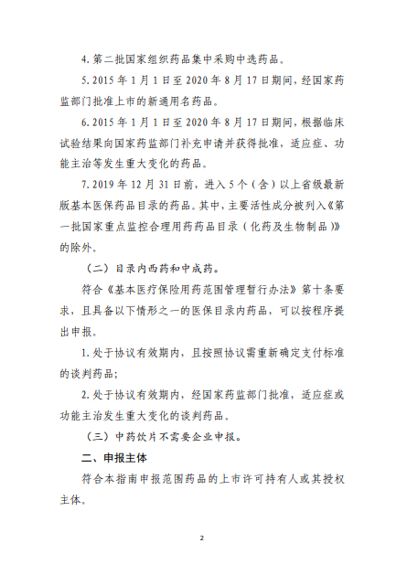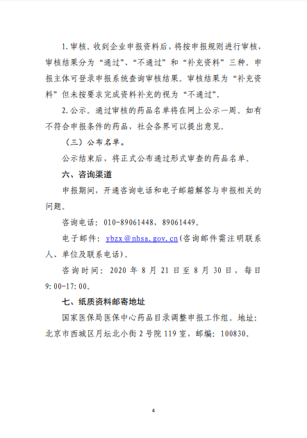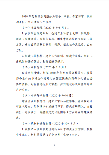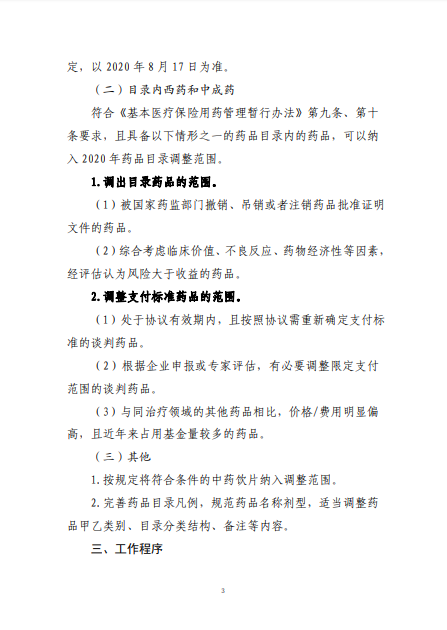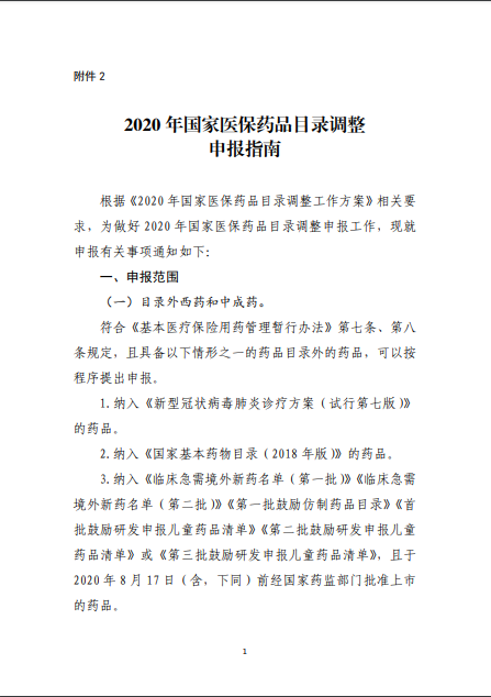 2020年8月3日-10日,国家医疗保障局就《2020年国家医保药品目录调整工作方案(征求意见稿)》向社会公开征求了意见。8月17日,《2020年国家医保药品目录调整工作方案》和《2020年国家医保药品目录调整申报指南》正式公布。